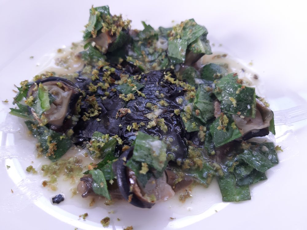 La “Lumaca piccante al verde di borragine” è un piatto che piacerà anche a coloro non si sognerebbero mai di mangiarne: lunga e delicata cottura restituisce alla lumaca un sapore vegetale che si sposa con le note della borragine.