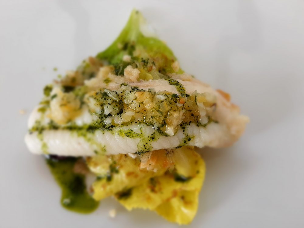 Si sale sulla carrozza dell’amaro con la “Sogliola, lattuga e bergamotto” dedicato a Piergiorgio Parini (chef amico e famoso per i suoi ingredienti vegetali).
