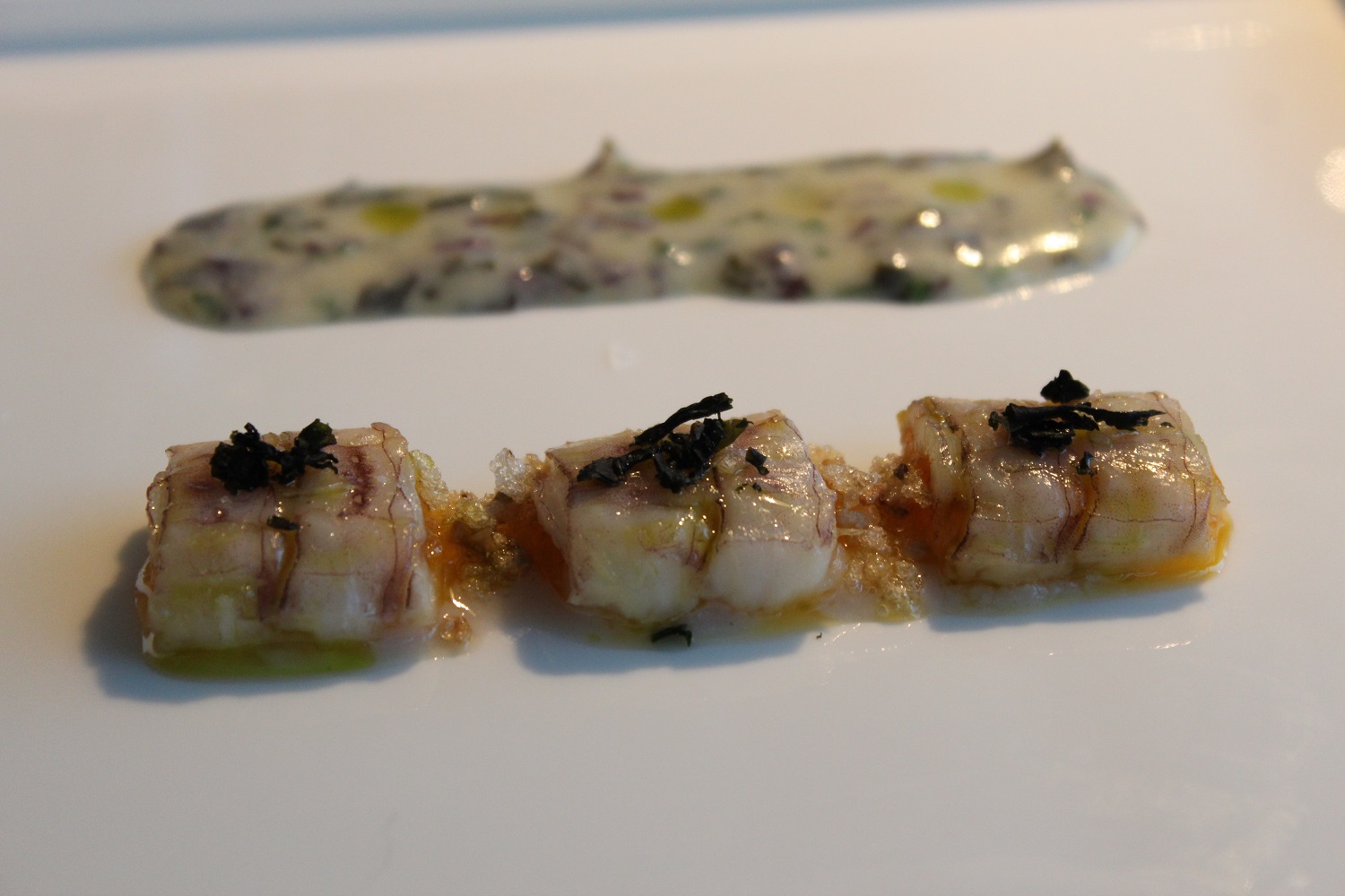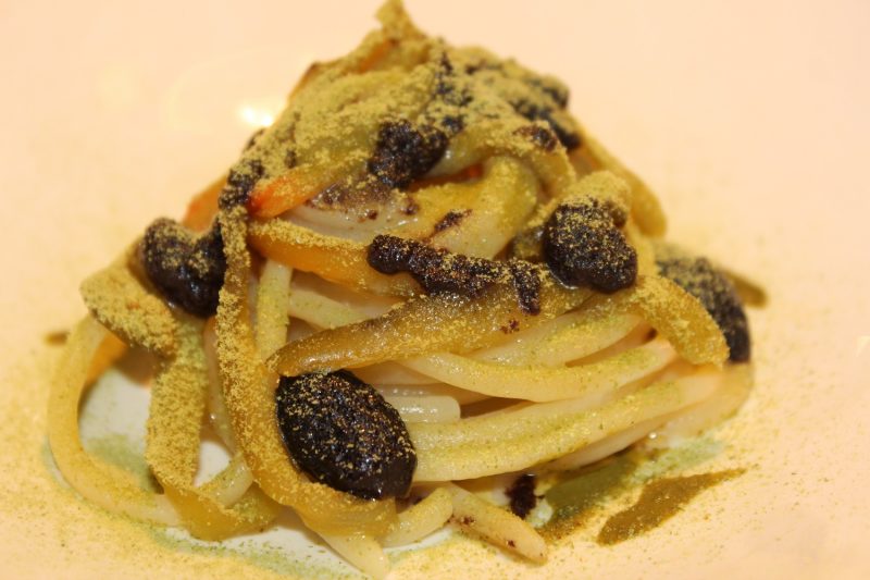 La pasta secca è il vero piatto dell’unità nazionale, siamo conosciuti per questo prodotto nel mondo. Da Uliassi le paste secche nel nuovo lab sono due, cosa che non avviene sempre nell’alta ristorazione. Nella tradizione i sughi per condire la pasta, spesso sono molto ricchi e qualche volte coprono la pasta. Il Lavoro su condimenti che esaltino la pasta, come in questo caso, è senza dubbio il futuro. Nella past ain bianco, il sapore delle aringhe è deciso, l’affumicato allunga le sensazioni di godimento, il pepe di timut, che in realtà non è proprio un pepe, ha toni agrumati e fruttati, che danno la svolta al piatto. Dal burro aromatizzato all’aringa ottengono una sorta di “ricotta”, (la virgoletto perché non è il termine corretto, ma rende bene l’idea) che diventa il vero condimento alla pasta. Me lo sono proprio goduto. Gli spaghetti olive neri ai carboni, eucalipto, peperoni e acidulato di umebosci, profumano d’estate, ti avvolgono in un abbraccio goloso, perché la pasta è anche e soprattutto questo.