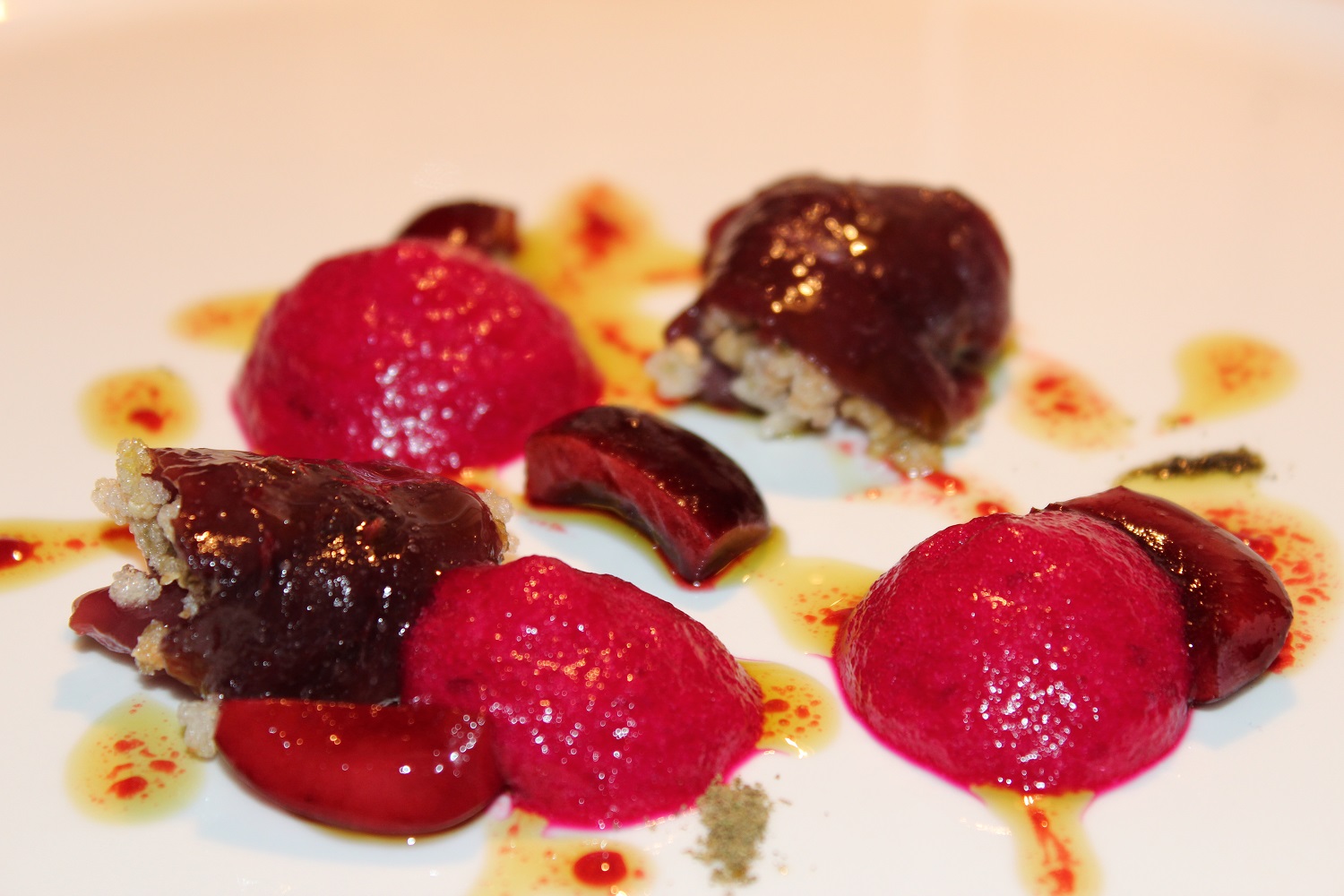 L’aperitivo è quello consolidato, sempre delizioso, con l’aggiunta dell’éclair di barbabietola con semi di zucca tostati e il porro spuma di porro, pinoli e tamarindo.