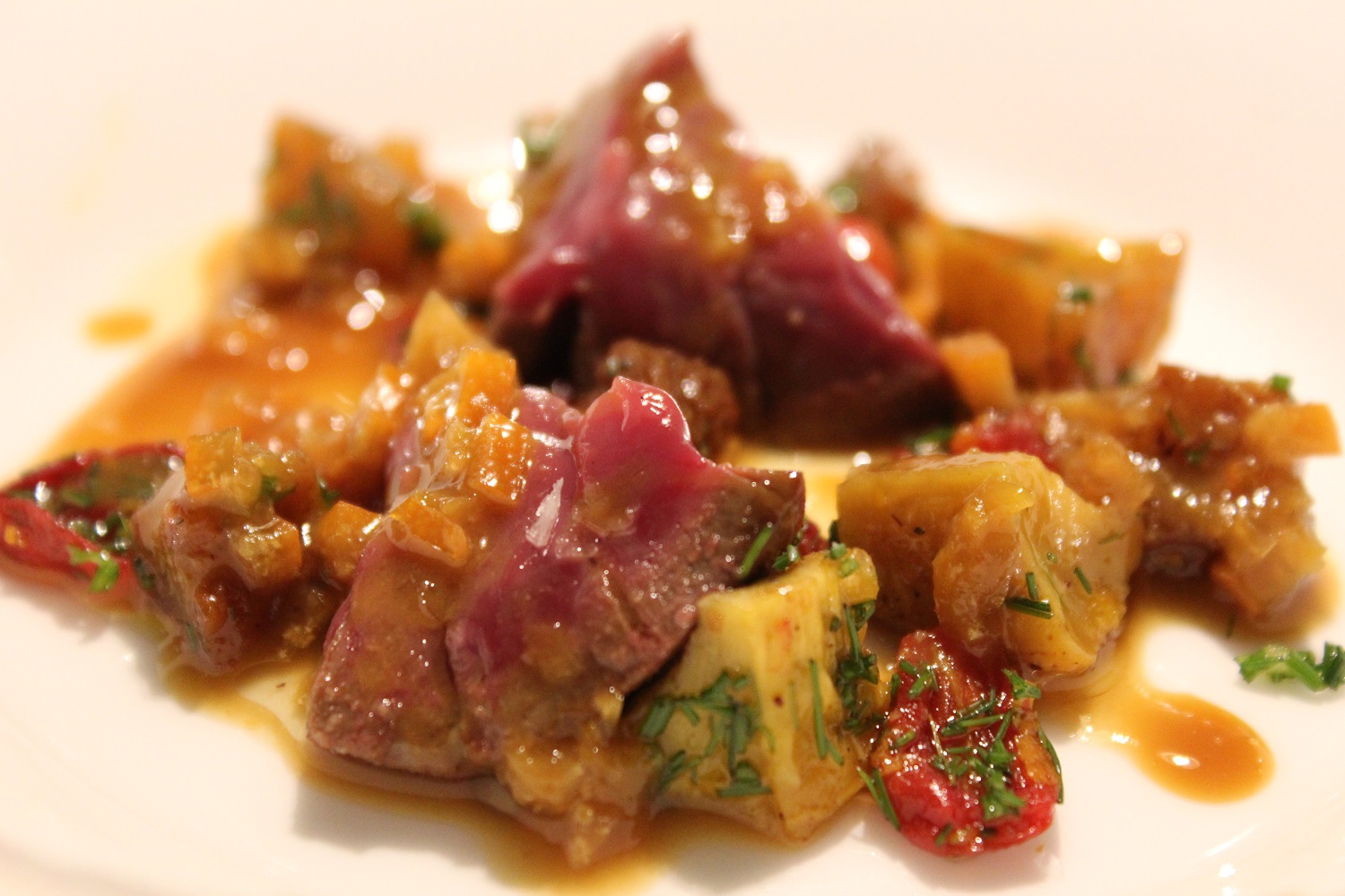 Chiusura strong, come da consuetudine per il lab, con il rognone di pecora, pesche e albicocche marchigiane, ristretto di arancia. In mezzo a tanta bellezza, forse il piatto del viaggio. Per usare un’altra metafora, il brutto anatroccolo, il rognone in questocaso, diventa un cigno bellissimo. Intenso e violento il rognone trova eleganza e golosità grazie al lavoro sulla frutta. La grazia di questo piatto è davvero inaspettata, perciò ancor di più apprezzata.