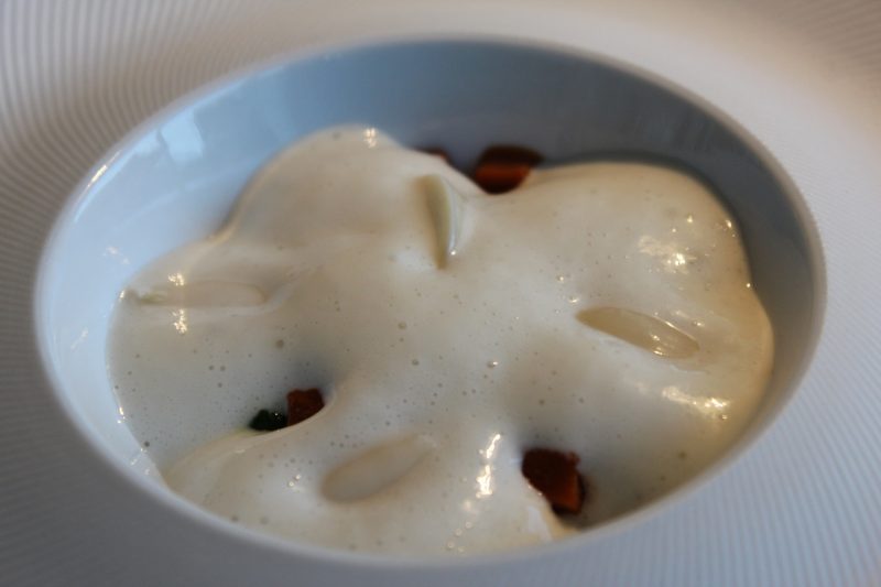 Il primo assaggio è l’ostrica alla contadina con grasso di ciauscolo, già presente nel lab 2019. Sempre per restare in tema di paragoni con la formula 1, è come se al primo giro disponibile realizzi il miglior giro sulla pista e parti in pole position. Grassezza e sapidità che si scontrano, una sensazione di rancido che fa da leitmotiv. Tra le ostriche più buone che abbia mai mangiato. Il pancotto di mandorle con ricci di mare (piatto oramai tra i classici). Il lavoro sulle mandorle è notevole, consistenze diverse, il pancotto rassicurante, i ricci ghiacciati una ventata di iodio irruenta. Una prospettiva quasi onirica e psichedelica, per un piatto di chiara tradizione contadina come il pancotto.