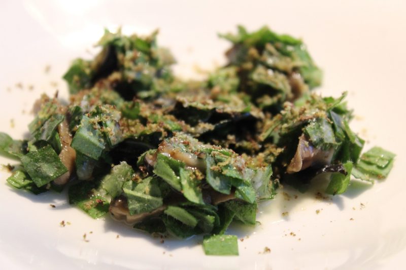 Le cannocchie alla coque con bernese alle alghe. I crostacei cambiano consistenza, diventano soffici, quasi cremosi, una meravigliosa salsa di stampo classico con l’aggiunta delle alghe completano il piatto. Scarpetta obbligatoria, non farlo sarebbe un reato. Provando le lumache piccanti e verde di borragine, mi sono venute in mente generazioni di chef che per cucinare le lumache aggiungevano grasso (plus de beurre, chi conosce la Francia sa di cosa parlo) spesso coprendone il gusto. In questo piatto c’è solo quello strettamente necessario e l’intenso gusto vegetale della borragine è come riportarle nel loro ambiante naturale. Genialata.