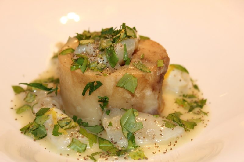 Adesso un piatto per spezzare e ripartire il percorso del Lab – mi dice Mauro – Colombaccio crudo, rapa, liquerizia, ciliegie fredde e olio di rosmarino bruciato. Resto spiazzato nell’ascoltare gli ingredienti, ma ancora di più quando lo provo. E’ vero, è un piatto che spezza, il freddo, la violenza del colombaccio l’acidità delle ciliegie ti fanno venire voglia di ripartire. L’ossobuco alla marinara, presente anche nel lab 2019, è il collante tra il mondo animale e quello marino. Le trippette di baccalà è il midollo trovano similitudini di consistenza e di gusto per un piatto di grande golosità.