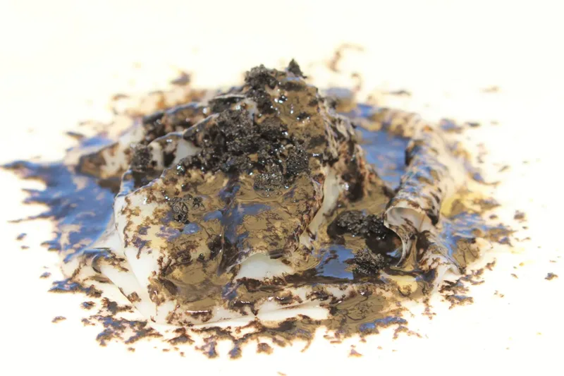 Un mare intenso, irruento come in una tempesta invernale. Dopo aver agitato con l’apposita frustina le salse e il brodo, il tutto va bevuto dalla porcellana che somiglia ad una conchiglia. La sensazione è quella di essere colpiti da un’onda improvvisa, con forza e veemenza. Intenso e persistente nelle sensazioni palatali.