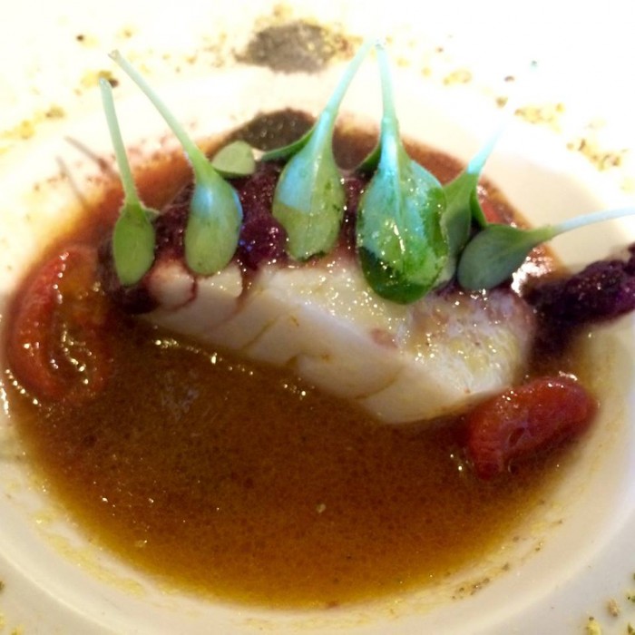 Poi la triglia e mele su guazzetto di melanzane, delicata e ben architettata nella sua presentazione e dal gusto non stravolto.