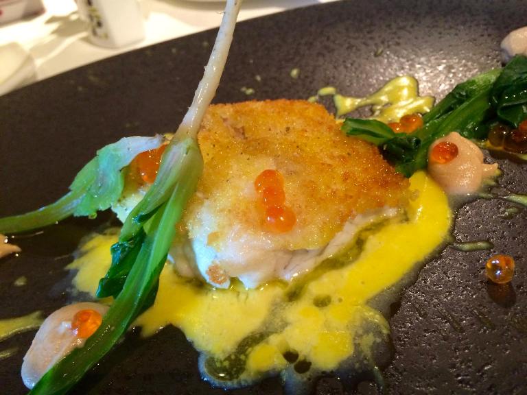 Ed ecco una scaloppa di Cernia in crosta di pane, con finta maionese di nocciole e verdure alla salvia.