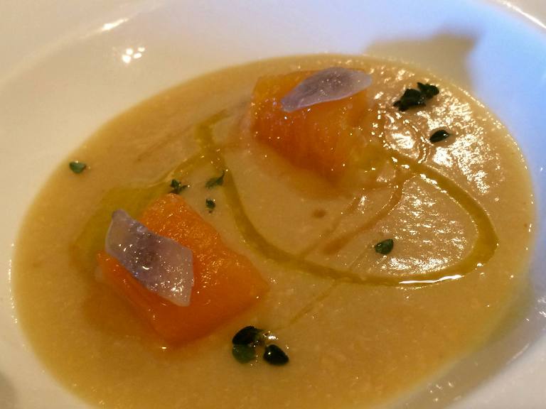 L’inizio è con dei grissini fatti da Felice, come il pane: insomma come tutto, tranne un ottimo calice di spumante rosé d’Arapri che fa d’accompagnamento ad una crema di ceci e zucca rinfrescati dal timo limonato, un piacevole modo per predisporre il palato agli antipasti tutti studiati e ottimamente calibrati.
