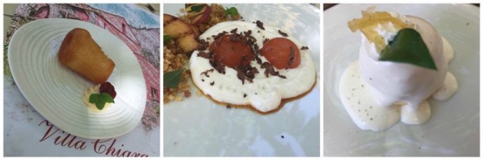 Villa Chiara Orto e Cucina, i dolci: il babà, la delizia al limone e Occhi di bue (finto gel di pesca e mango, spuma di latte di mandorla, caramello bianco e crumble alla lavanda)
