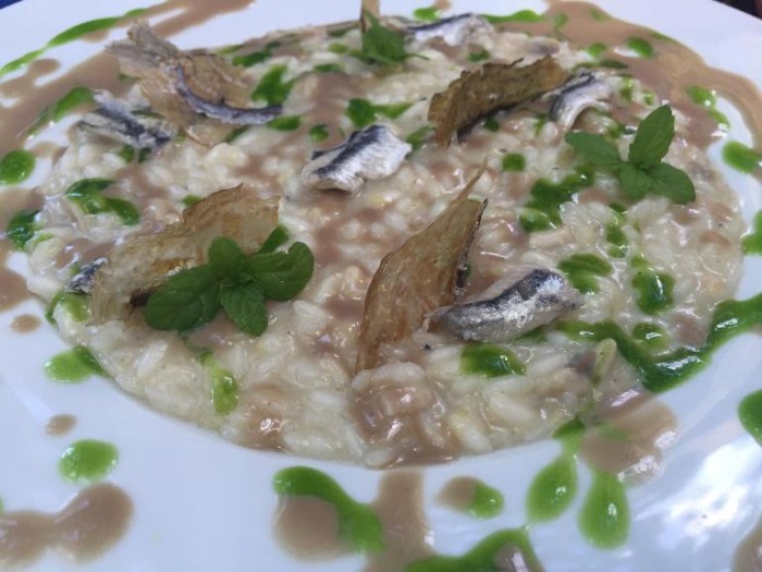 Villa Chiara Orto e Cucina, riso provola e alici (risotto mantecato con pelle di provola e profumo di limone e variazione di alici in clorofilla)