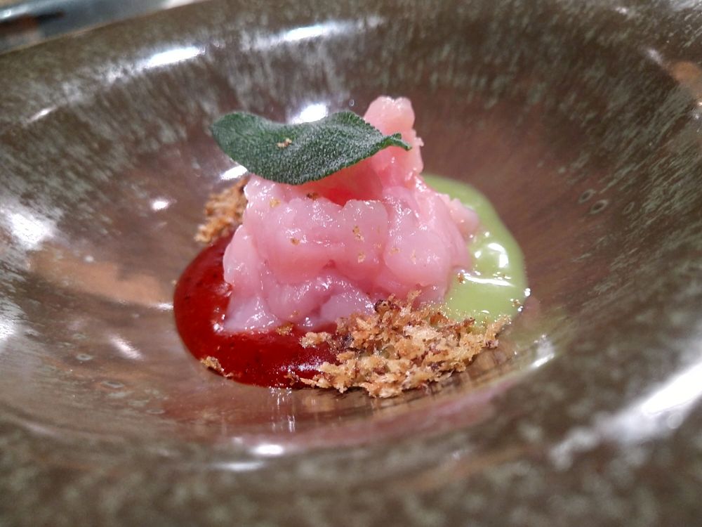 A seguire Animella, sedano e aceto di lampone: eccellente la consistenza dell’animella, divertente il contrappunto con la croccantezza del sedano che la accompagnava.