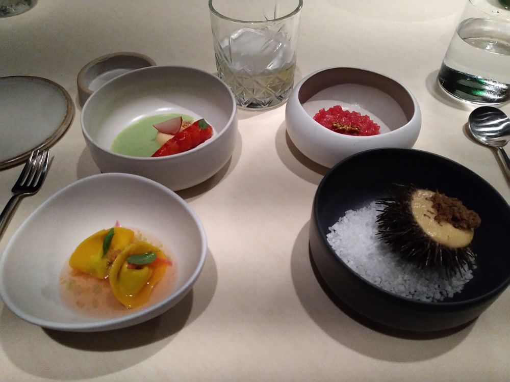 Abbiamo iniziato con una serie di entrée molto interessanti, che incuriosiscono il palato e preparano alla successione di piatti presentati dallo chef.