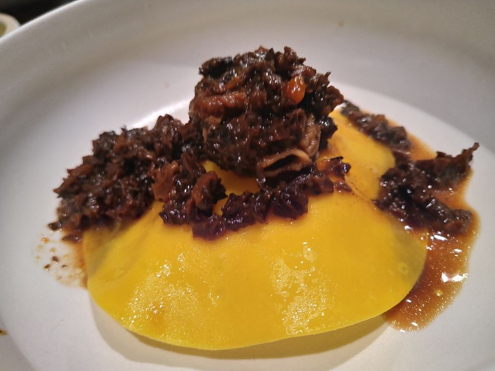 Per continuare: potrebbe sembrar un azzardo ma il ‘raviolo’ aperto con seppia e spugnole è un riuscito connubio di mare e bosco.