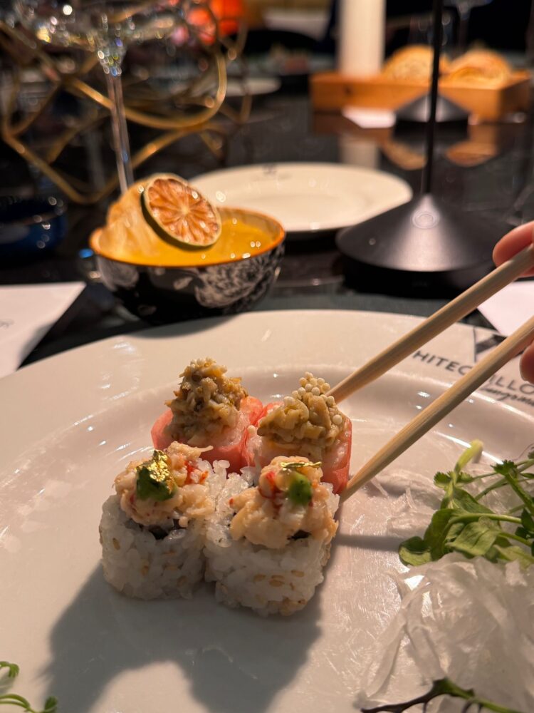 Gusto, estro ed estetica viaggiano a braccetto e si palesano in una delle creazioni più iconiche: il White 24K Roll, eleganza e precisione, tecnica e sapore. Tonno rosso, gambero di Mazara del Vallo e astice blu dialogano con note raffinate, agrumate e iodate, in un equilibrio dove anche l’elemento più scenografico, la foglia d’oro, resta al servizio del gusto. L’abbinamento con un cocktail a base di rum giapponese ha fatto centro.