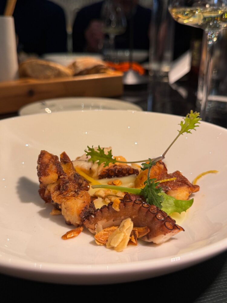 Il percorso si arricchisce con una serie di antipasti che lavorano su struttura e profondità. Geometrie di Salmone è un piatto che incentra il suo essere sull’equilibrio tra acidità e morbidezza, tra solidità e freschezza. Un esercizio di stile che dimostra come la tecnica possa diventare racconto, senza mai risultare una parte a se stante. Ottima la gestione delle consistenze del disco solido di salsa ponzu, della creme fresh al limone e del pane carasau. L’octopus infusion, regala un bel gioco tra il polpo croccante e quello arrosto che risulta tenace ma in maniera piacevole. I lupini in fiamme sono belli da vedere e ottimi al palato, la cenere ricreata con i carboni attivi e proprio simpatica e sfiziosa. L’oro d’Islanda fa sempre la sua parte, baccalà fritto e friarielli sono una coppia di fatto che ha la benedizione di tutti.