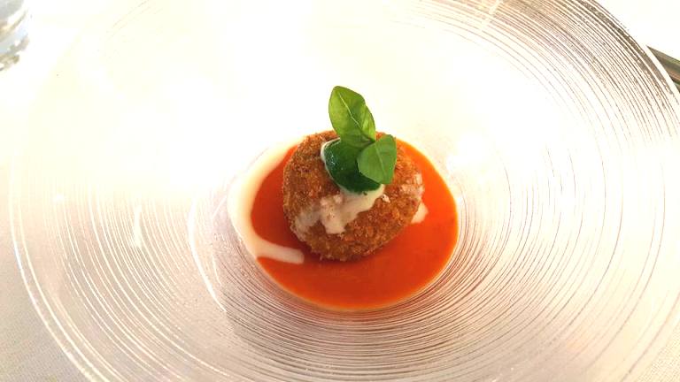 Per iniziare un benvenuto costituito da una polpetta di melanzane, latte di bufala e Pomodoro Antico di Napoli.