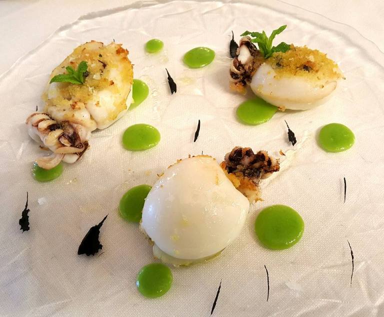 Tra gli antipasti un polpo cotto magistralmente gustato con la freschezza del plancton marino e la croccantezza del sedano, e seppie con pane, capperi, olive e piselli.