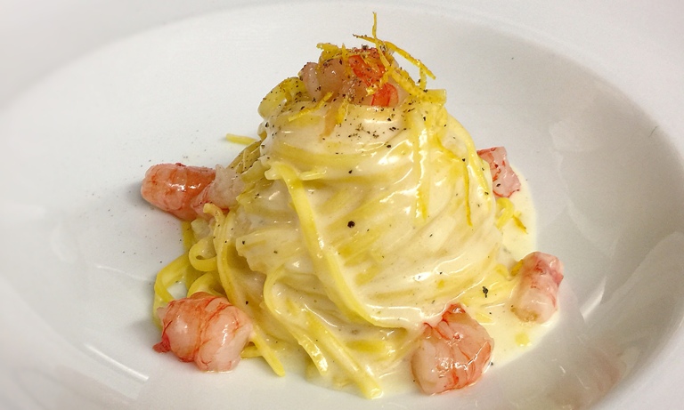 Casa Rispoli, Tagliolino cacio e pepe e gamberi rossi crudi – foto Casa Rispoli