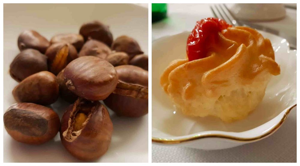 Il secondo di carne è composto da maialino con piselli, cipollotto e salsa alla camomilla, cottura eccellente per un risultato davvero indovinato per la tenerezza della materia prima e l’intelligente accompagnamento di elementi che valorizzano il sapore di fondo.