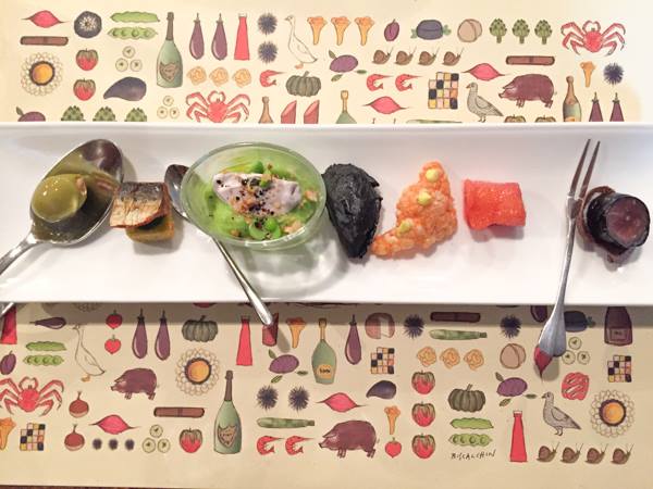 Al Pont de Ferr, alga Hanoi-salmone marinato-cialda gamberi, senape-finta cozza di ceci neri e nero di seppia-crema broccoli,piselli-cubo di polenta- oliva martin