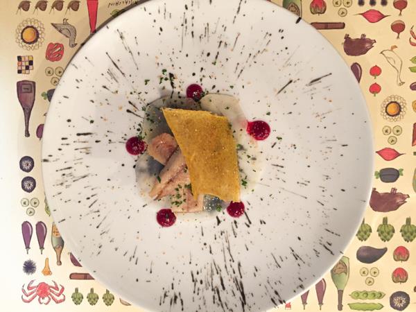 Al Pont de Ferr, anguilla affumicata artigianalmente su dischi di daycon, gocce di barbabietola e croccante di polenta piccante