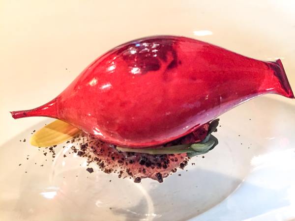 Un piatto creato da Matias Perdomo mantenuto in carta, simpatico, moderno e sorprendente è la cipolla rossa di Tropea di zucchero soffiato, ripiena di formaggio di capra e cipolla caramellata, presentato alla fine del pranzo quasi come predessert per la sua dolcezza e per gli abbinamenti perfettamente indovinati di dolce e salato.