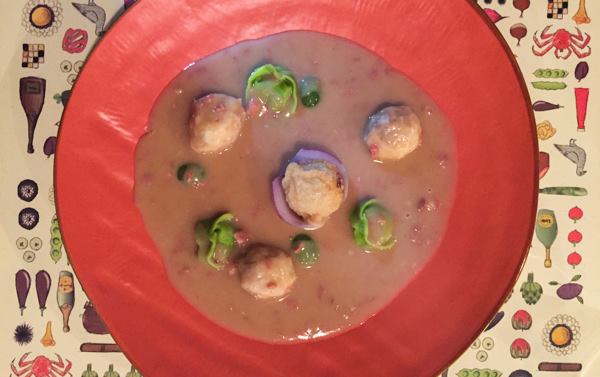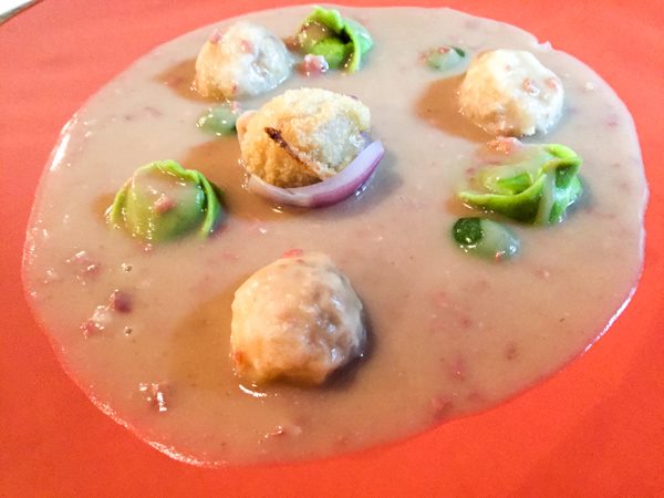 Al Pont de Ferr, ravioli e pallottine ripiene di fagioli con verdure e salsa dei fagioli con pancetta saltata