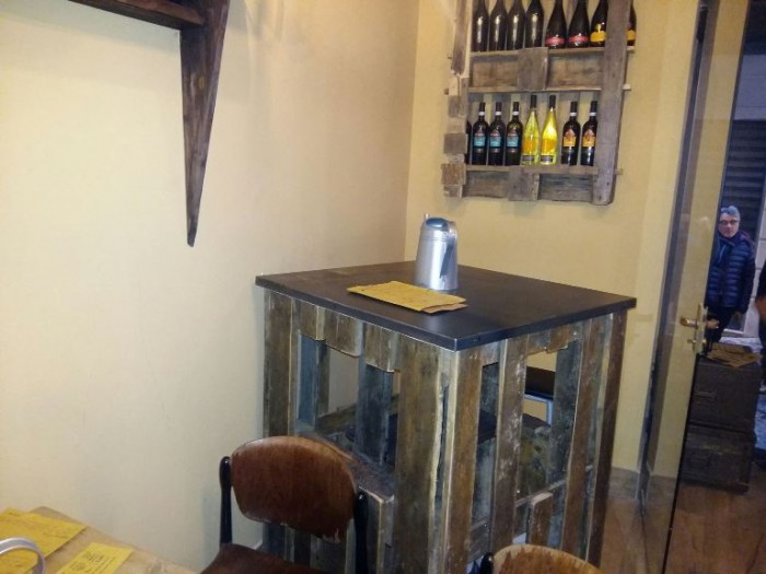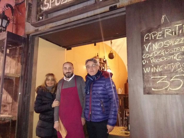 Spuzzulè a Napoli. Il lampadario è un pezzo di aratro, il bancone è fatto con due vecchie porte inutilizzate di una casa ai Quartieri Spagnoli. E poi ci sono i tavoli, realizzati con le pedane in legno per il trasporto merci, recuperate in giro e persino sul marciapiede della Galleria Umberto, durante i lavori di restyling. Sono solo alcuni degli arredi di Spuzzulè, il ristorantino aperto recentemente da Bruno De Crescenzo a due passi da via Toledo, in via Sergente Maggiore. Proprio dove era titolare di un negozio di articoli per informatica.