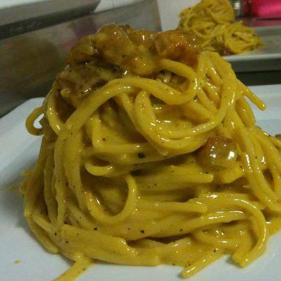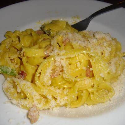 Ebbene. Ho mangiato un piatto di fettuccine alla carbonara con i fiori di zucca e … la panna. Si. La panna.