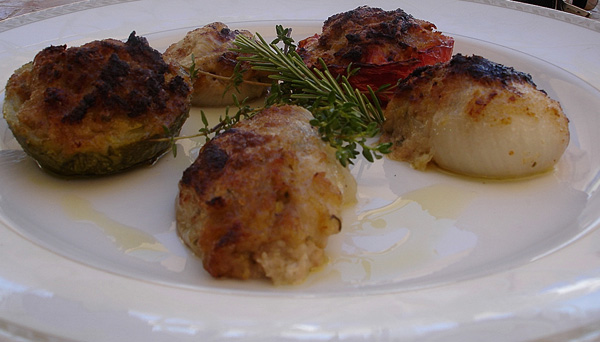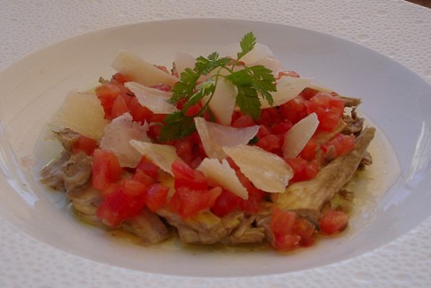 Esperimento per altro già relativamente collaudato negli scorsi anni a Vallauris con l’aiuto del fratello, al Cafè Llorca. E allora ecco qualche trancio di pane grigliato con pomodoro concassè e con prosciutto iberico ( non all’altezza) , invece sono ottimi i “farcis niçoise” , tenere e morbide verdure farcite ( pomodori, cipolle , zucchine …) e gratinate in forno. Inaspettata e ben riuscita la fresca di insalata di carciofi crudi ( si , anche in agosto in Francia si trovano ottimi carciofi…), accompagnati da pomodoro fresco, scaglie di vecchio parmigiano e vinaigrette cremosa.