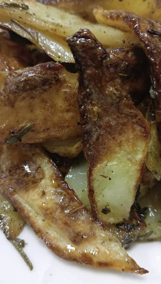 Oca del Batte, coniglio di Derna (porchettato con fave) e stocco di Bea, i secondi, trionfo della cucina locale, da accompagnare a semplici ma buonissime erbe spontanee saltate in padella e a croccanti patate al forno a cui un cucchiaio di sugna dona profumi antichi.