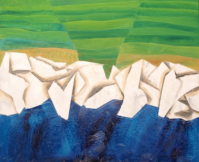 In Liguria la terra e la roccia tendono ad accatastarsi sul mare, a mettere rughe alla costa, ad affastellare lo spazio, che è scarso per tutto, tanto che non sai mai dove finisce il mare e dove comincia la campagna, quanto mare porti con sé il sasso sotto la terra. Troppo facile un bagnasciuga, gli scogli e il verde: qui entrano uno nell’altro, forse sono un tutt’uno in equilibrio, tanto da perdere l’orientamento, qualunque sia il punto di vista. Il mare, la roccia, la terra. Dal mare, dalla roccia, dalla terra. Dal cielo invece tutto si complica in un perpendicolo accartocciato, da srotolare simbolicamente, come nel quadro.