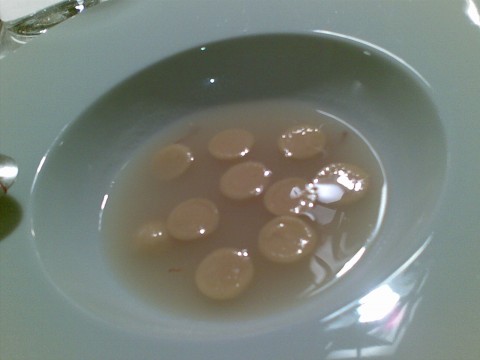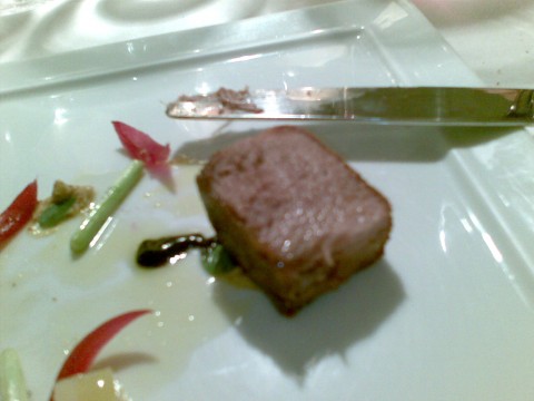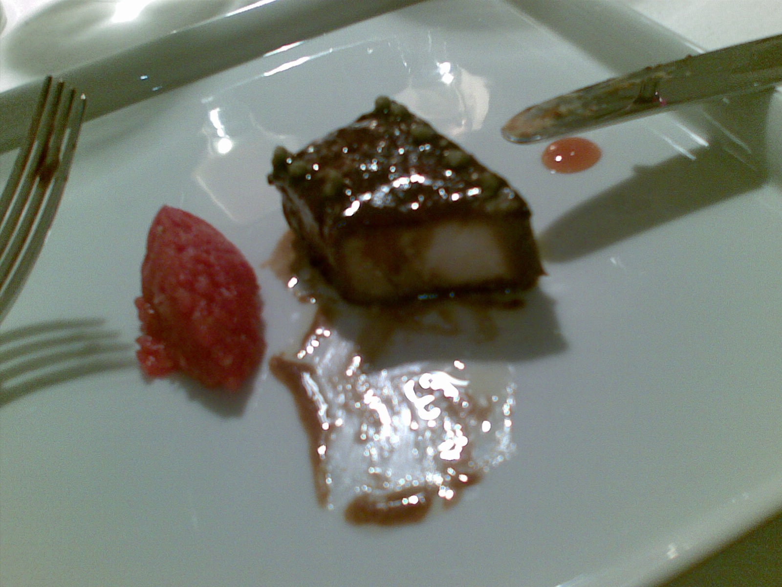 Chiedo scusa per la foto sfuocata, ma eravamo con un cellulare e il quinto grande piatto della serata è mortificato. Ma vi assicuro che è strepitoso: anche qui si libera dai lacciuoli della tradizioni: con l’idea dovete andare al succo di pomodoro condito, dove il limone aggiunge acidità ad acidità toccando l’estremo possibile per la piacevolezza.