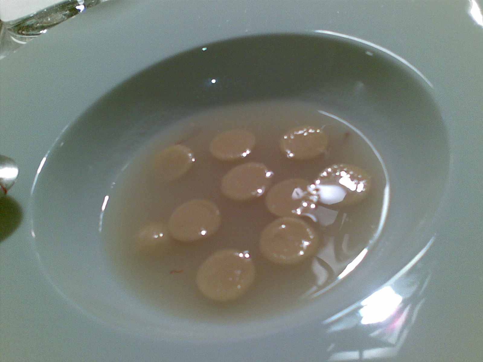 Il croccante espressione della lingua in realtà è foie gras senza essere né foie e né gras: la morbidezza totale si ottiene sciogliendo la lingua (scusate ma siamo in terra di Paolini e non resisto ai suoi mitici giochi di parole) in una lunga cottura nel latte, poi si mette sottovuoto e infine si impiastra per ottenere la crosta. Le fibre cedono tutta la loro durezza e rilasciano sapore intenso dolce, si potrebbe usare anche il cucchiaio.