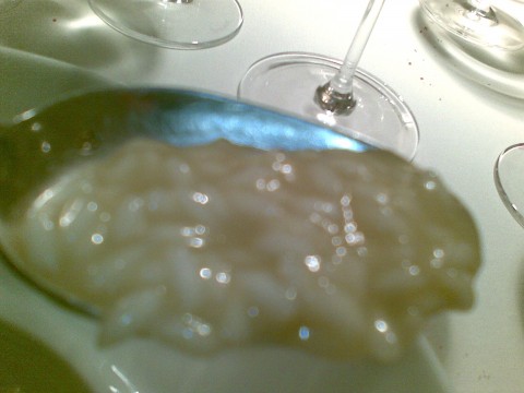 Il riso non è mantecato, ma ha due cotture: la prima portata sino ad ottenere una crema di amido poi filtrata, la seconda come da prassi risottina. Dunque riso nel riso per ottenerne l’essenza. Un piatto che parte come una freccia e procede spedito, impossibile stancarsi grazie alla freschezza usata senza mediazione e senza alcuna voglia di contrastare alcunché.