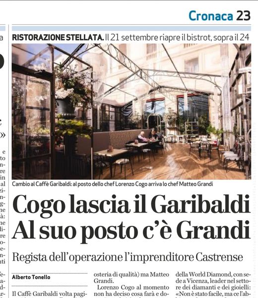 Lorenzo Cogo lascia il Caffè Garibaldi e nel cuore della bellissima città veneta arriva Matteo Grandi da San Bonifacio in provincia di Verona. Un cambio di stelle di cui dà notizia in anteprima oggi il collega Alberto Tonello, giornalista professionista al Giornale di Vicenza e autorevole firma dell’enogastronomia.