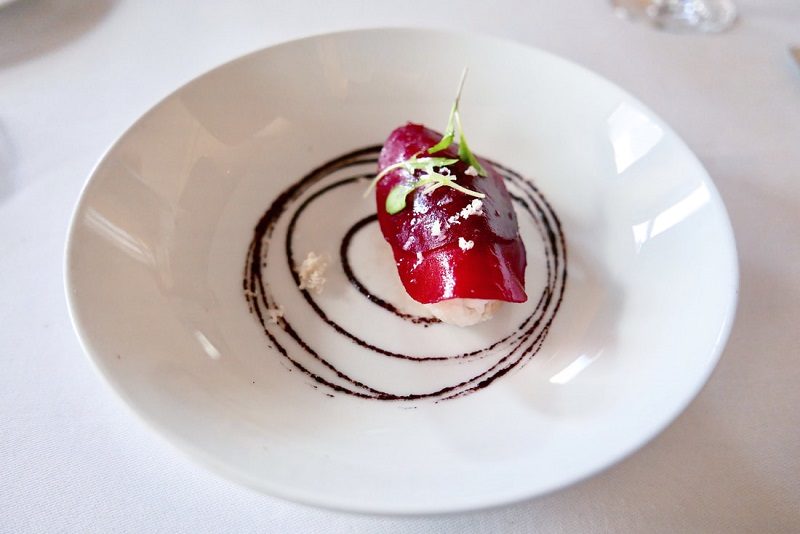 Il piatto che iconicamente segna questo passaggio è il finto sushi di barbabietola. Due fette molto sottili di barbabietola, marinate nel loro stesso succo, prendevano il posto del pesce, adagiate sul riso, nella più classica delle preparazioni giapponesi, una grattata di rafano terminava il tutto. La barbabietola prendeva la consistenza del pesce, ma in bocca restituiva tutta la forza della terra.