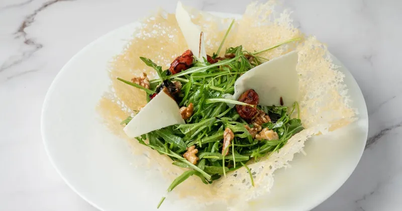 Cestino di parmigiano con insalatona di rucola, noci, pomodorini, scaglie di pecorino ed aceto balsamico