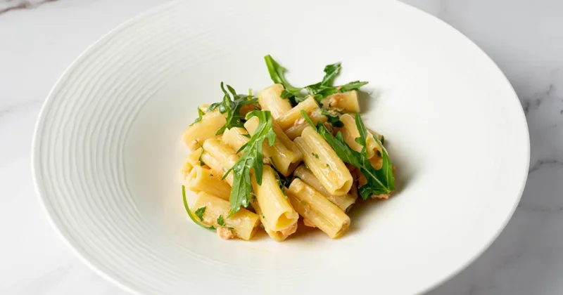 Rigacuore con salmone fresco, rucola e scorzetta di limone
