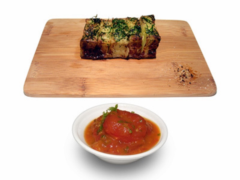 Un parallelepipedo di melanzane e una ciotola con una composta di pomodorini, il tataky di melanzana appunto. Il tataki, chiamato anche tosa-mi è una tecnica della cucina giapponese, usata sia per carne che per il pesce. L’idea era quella di trattare la melanzana come un pezzo di carne. Una volta Scabin mi disse: “Immagina un filetto di vitello, la cura che un cuoco pone nel lavorarlo. Io quella cura, quell’attenzione la metto su una melanzana”. Il parallelepipedo di melanzana aveva due lati aperti, incisi, seguendo il verso delle fibre, proprio come si fa con la carne, in modo da permettere ai condimenti di entrare in profondità.