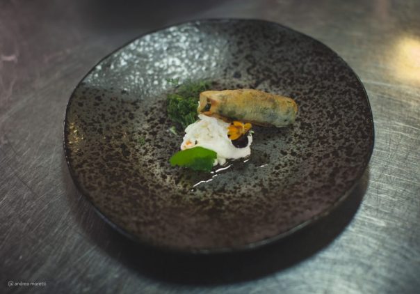 E nella sala dell’Hotel Baglioni, presentato da Mecca Ibrahim di Great Italian Chefs, propone un piatto a base di pasta secca, sì, ma ammollata e fermentata per trasformarla – con aggiunta di lievito madre – in un impasto da modellare a mo’ di cannolo e farcire con mozzarella tritata e un misto di erbe e verdure selvatiche raccolte nei campi che circondano il ristorante, dai nomi intraducibili. Per finire, petali di fiori, erbe selvatiche e succo d’arancia concentrato. Non si tratta, però, di una sperimentazione a tutti i costi quanto di un’elaborazione di un piatto tradizionale sardo, le tallutzas de coxia: la pasta della domenica ottenuta da quello che avanzava dell’impasto per su coccoi, il tipico pane di semola di grano duro, dunque una pasta fermentata.