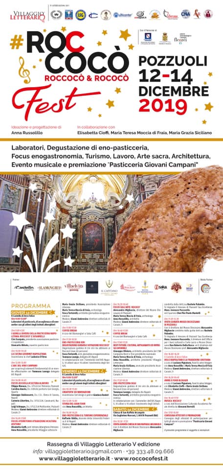 Ed a lui, al dolce inventato tanti secoli fa dalle monache della Maddalena è dedicata la prima edizione del “Roccocò Fest. Roccocò e Rococò” evento in programma, dal 12 al 14 dicembre, nel Castello di Arco Felice di Pozzuoli ed ideato dall’architetto Anna Russolillo nell’ambito della quinta rassegna del “Villaggio Letterario”. Tre giornate di immersione totale nella storia della grande pasticceria napoletana, arricchite da concerti, laboratori, degustazioni, visite guidate a monumentali edifici religiosi come la chiesa di San Raffaele, compiuta espressione dell’arte e dell’architettura del rococò e che culmineranno nell’assegnazione del Premio “Giovane pasticcere campano” riservato agli allievi degli istituti alberghieri del territorio.