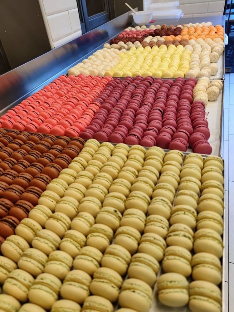 I macarons del Caffè Hungaria sono di grande tendenza: vengono scelti anche come box regalo, acquistati da asporto o ordinati come dolcetto a fine pasto. In laboratorio si realizzano circa 1200 pezzi a settimana. La ricetta è quella di Pier Hermè, rubata con gli occhi da Alessandro. I macaronsrosa di Capotosti sono uno degli elementi del “Pink Hour”:
