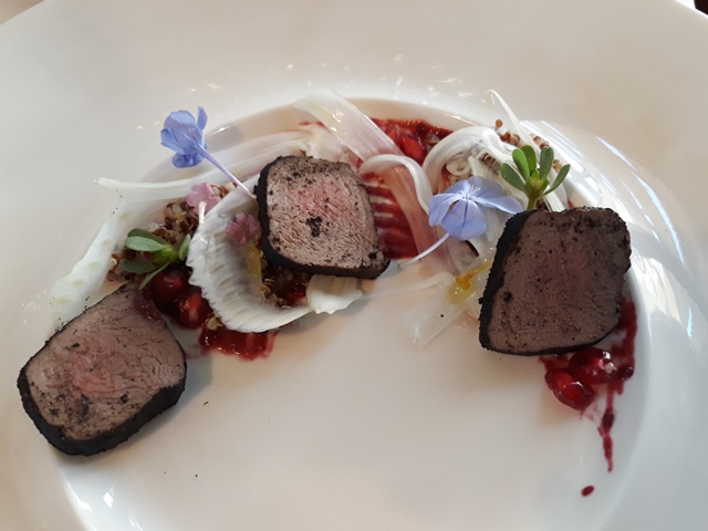 La seconda portata è una proposta che rimane delicata al palato: “Filetto i cervo, polvere di caffè, pepe nero, finocchio, melograno, quinoa”, accostato al Montepulciano d’Abruzzo Marina CVETIC .