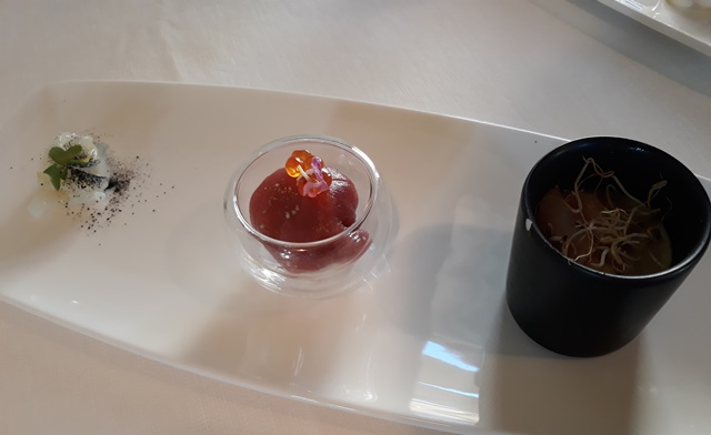L’antipasto ricorda l’accoglienza marchigiana a tavola: “Tonno. Panzanella e Burrata”: il tonno è preparato come un involtino farcito di tradizione italiana. E ancora “Seppia. Crudo di Calamaro, yuzu al limone, avocado”, più un fuori menu: una sorta di pudding di sushi con triglia, funghi porcini, colatura di alici e uovo. Gli antipasti sono abbinati al Grillo del Barone della Cantina Barone di Serramarrocco .
