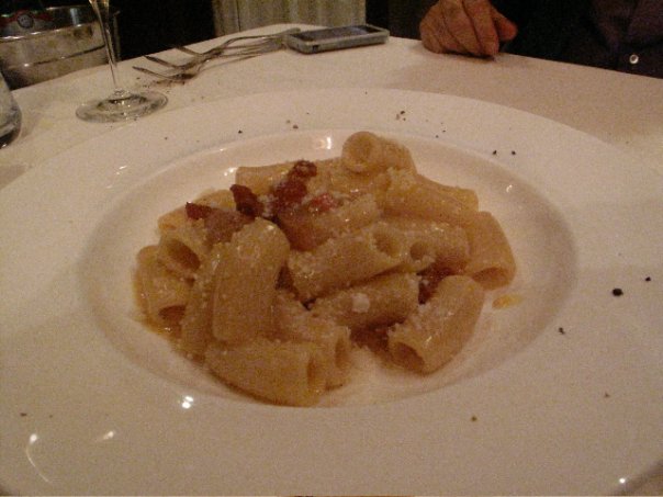 Rigatoni di Verrigni alla carbonara: la carbonara di Arcangelo è conosciuta in molto mondo. Mi piace riprodotta su una pasta corta e sublime come questa. Applausi a scena aperta e bocca piena,che deve esplodere di goduria.