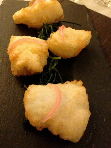 La tempura perfetta del baccalà, accompagnato da agretti che sembrano alghe, ricorda ancora una volta la terra di provenienza dello chef. Ma sempre in maniera gentile, mai aggressiva, nonostante il carattere deciso di alcuni piatti, come ad esempio la seppia affumicata con gelato di piselli e acacia, semitrasparente quasi come una medusa.