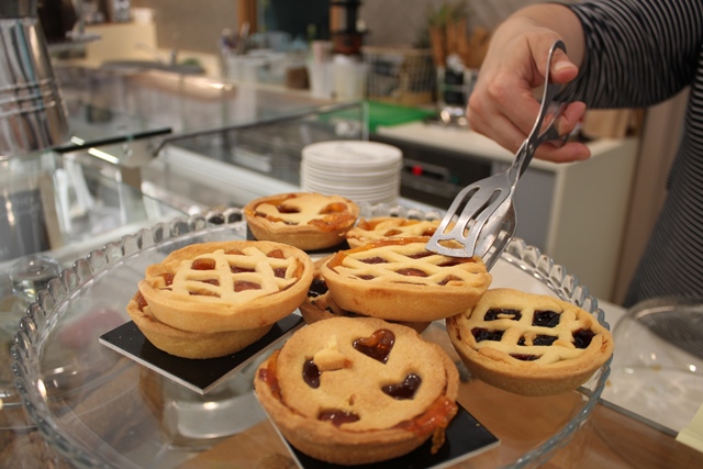 A colazione si inizia con il caffè, un mix di 98% di miscela arabica e 25% robusta, macinato al momento, croissant farciti sul posto con crema pasticcera classica, al cioccolato e al pistacchio, pain au chocolat, crostate, biscotti con farina d’orzo, diamantini al cacao, biscotti al caffè, biscottini alla cannella, pane fatto in casa, burro e marmellata, cupcakes, brioches, mattonelle cioccolato, pistacchio e fiori di sale.
