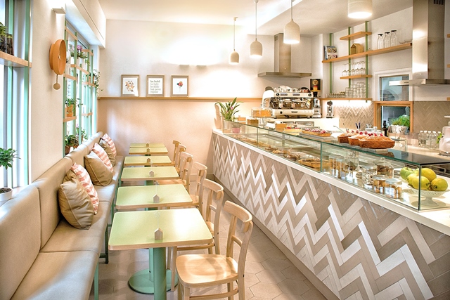 Il design è firmato Studio Lido, come per la sede di Marconi: il locale èfunzionale e luminoso, con elementi ispirati alla terra e all’aria e un lungo bancone protagonista dell’ambiente. Il pavimento è un evidente richiamo a una terrazza, un omaggio a Roma. Il suo colore preferito, il rosa, è predominante, anche nei complementi d’arredo. Il riferimento alla terra è presente anche nella scelta del legno: il rivestimento del bancone, delle panche e la rastrelliera, dedicata al mondo del pane, sono opera di un falegname.