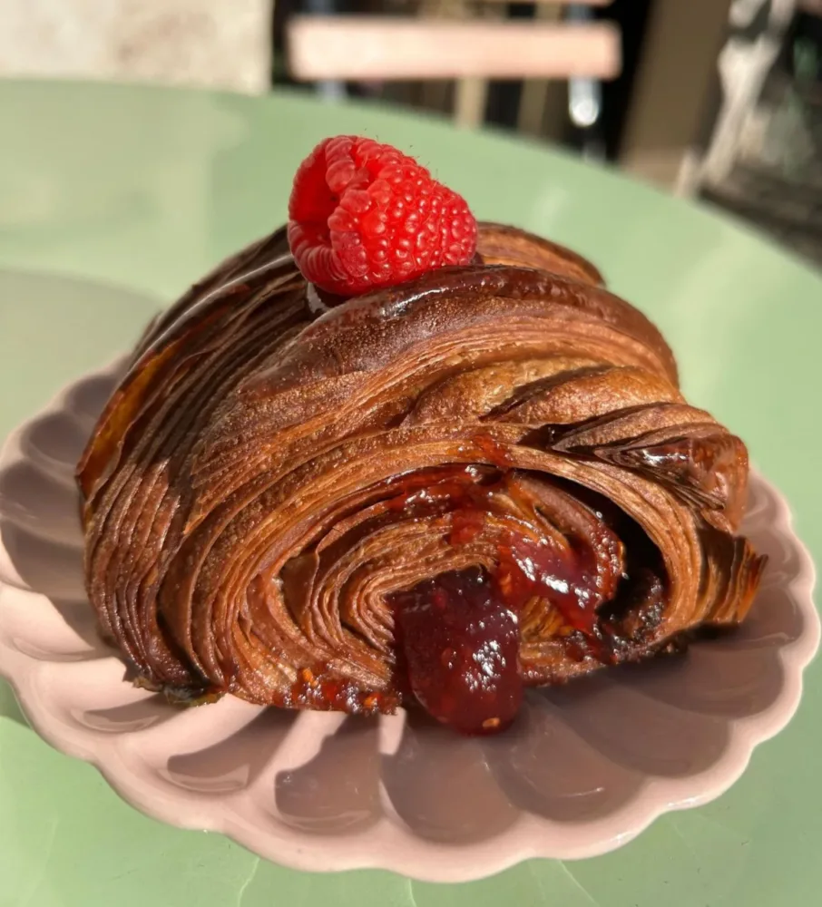Cafè Merenda – lievitato special con sfoglia al cacao, cioccolato e lamponi
